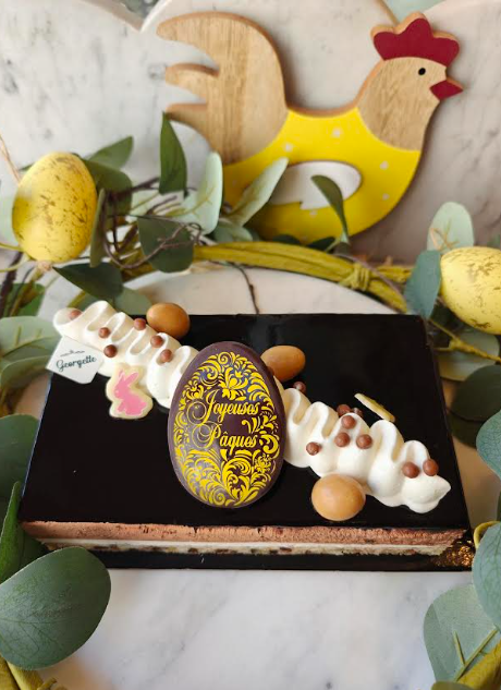 Pour Pâques, Georgette vous propose un entremets très gourmand : mousse au chocolat noir 64%, crème infusée à la tonka, financier cookie (pépites de chocolat & noisettes).