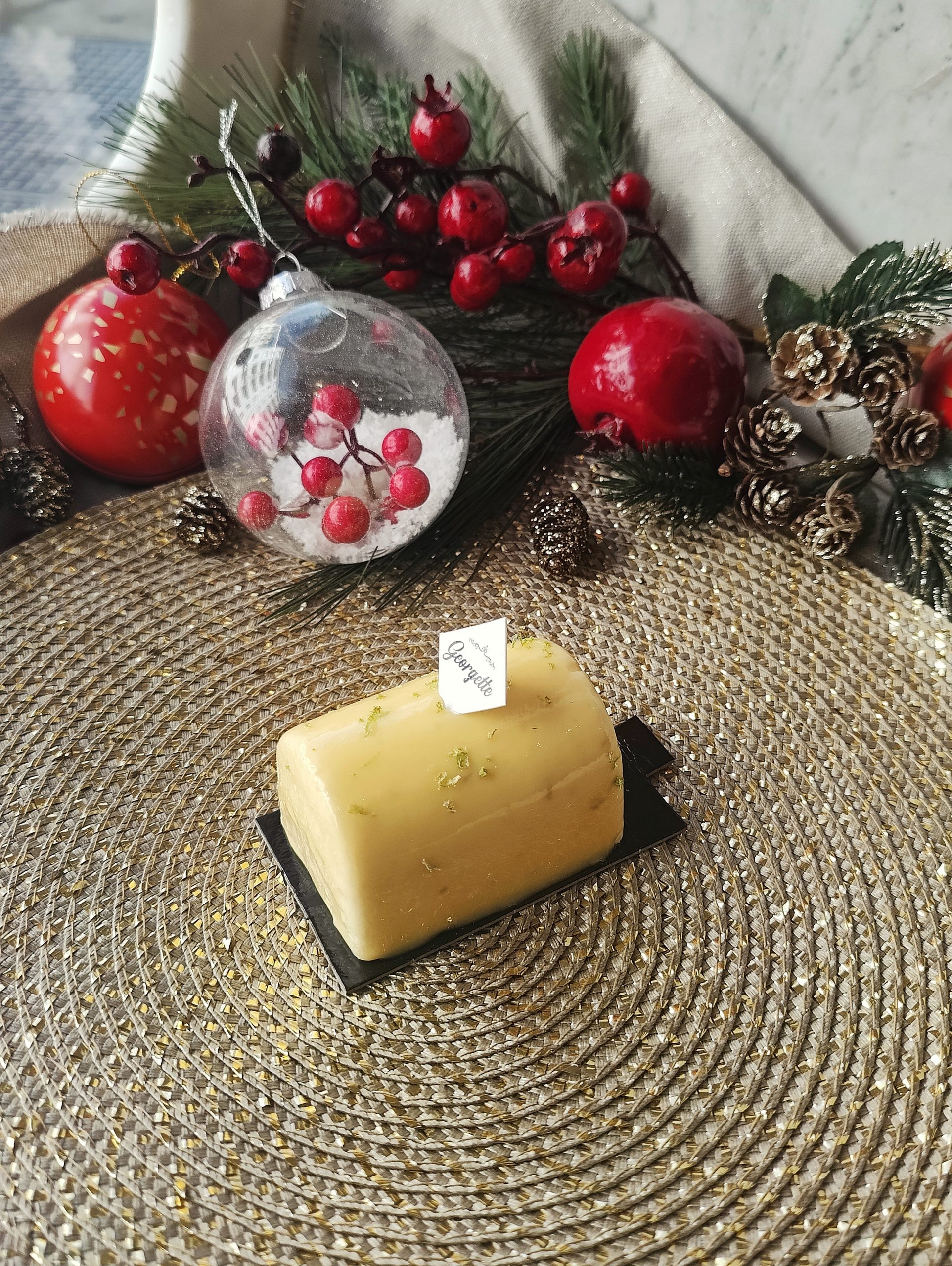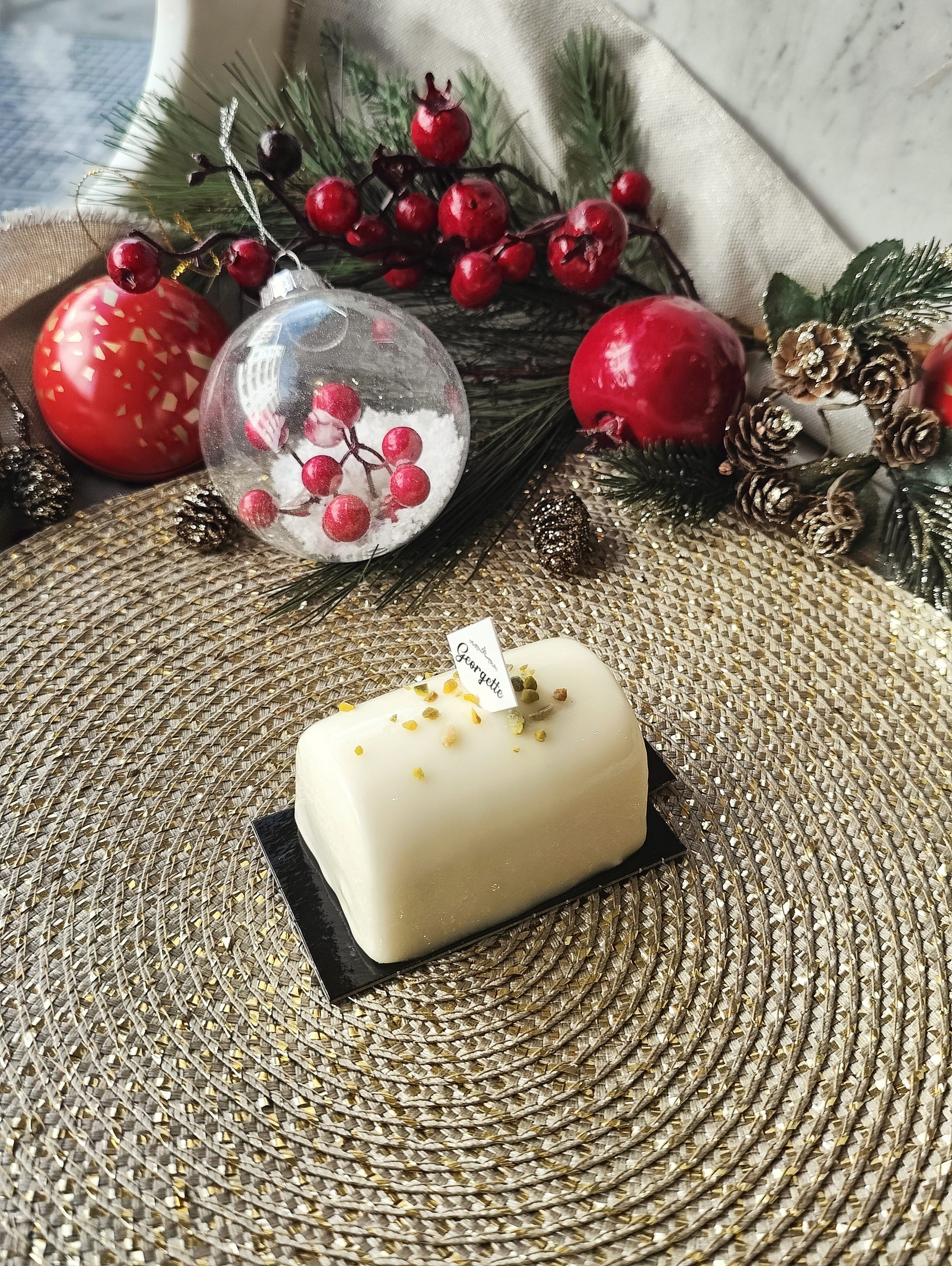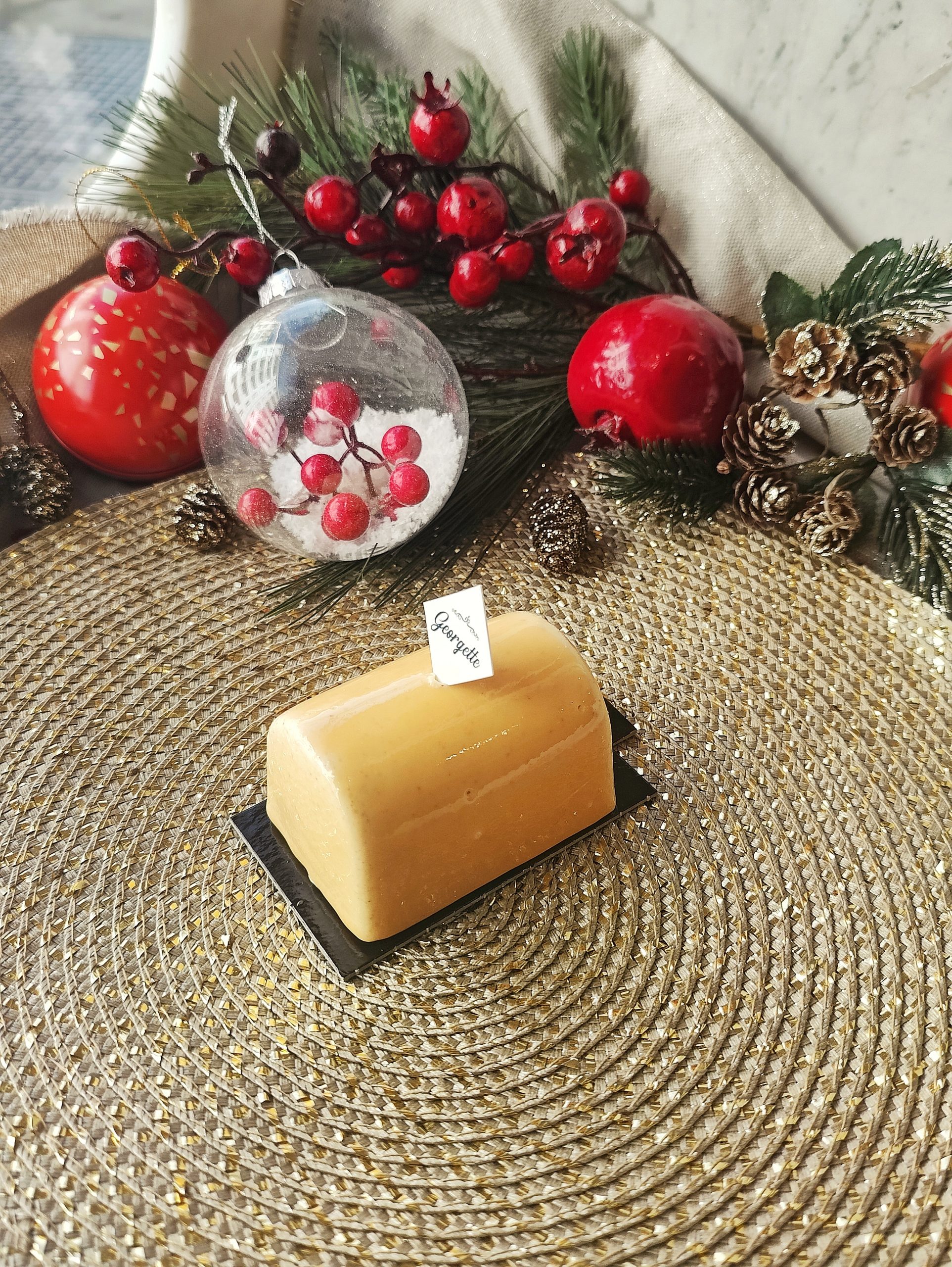 – LA FLEUR D’ORIENT : mousse fleur d’oranger, crémeux mandarine, croustillant & financier pistache. La plus parfumée de nos bûches !